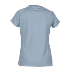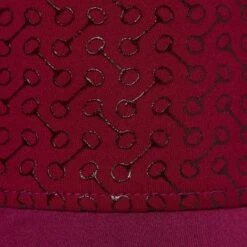 This chic and feminine show shirt is made of elastic, breathable and moisture wicking technical fabric. It has short sleeves, a tab collar, and a button placket. The buttons are decorated with crystals, and there is decorative embroidery on the front, back, and sleeves. The mesh shoulder insets assure breathability.