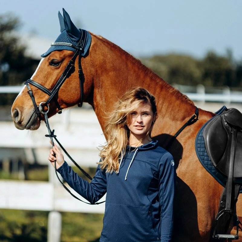 The Horze Lou Tech Shirt is perfect for daily training, hacking out, or casual wear outside of the barn. Functional fabric with breathable inserts provides ideal ventilation and prevents you from overheating. The high collar adds warmth when you need it and is adjustable for the perfect fit. The kangaroo front pocket keeps your hands warm and your belongings safe. Pretty colors match your riding wardrobe perfectly.