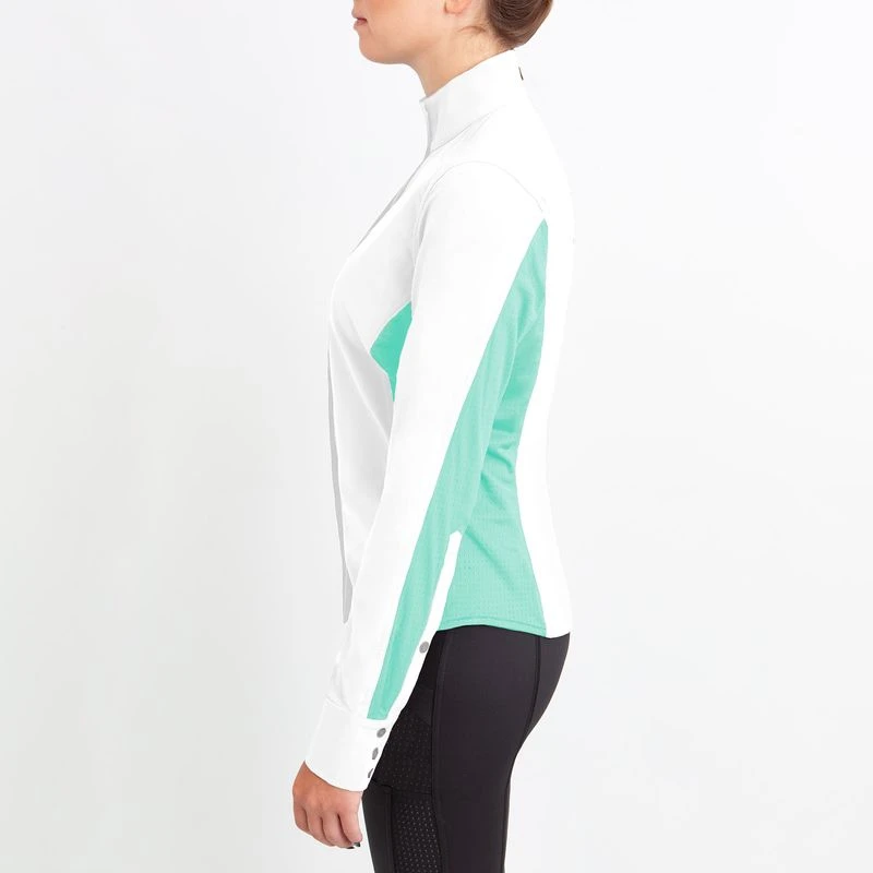 Constructed in lightweight 4-way stretch-woven CoolStretch fabric paired with high stretch IceMesh. Features include a button front, button cuffs, and shoulder darts that provide a beautiful fit and allows for optimum mobility.