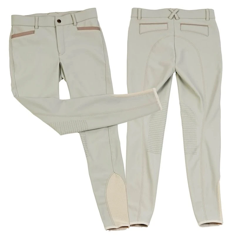 These classically styled breeches in a tech fabric will take them from lessons to the show ring in style. They feature a a front zip, mid rise waist with belt loops. The slash pockets are subtly accented in dark taupe, and the euro seat seaming is on trend. The silicon knee patch grips give them just the right amount of stick in the saddle, while the sock bottoms stay comfortable under boots or half chaps.